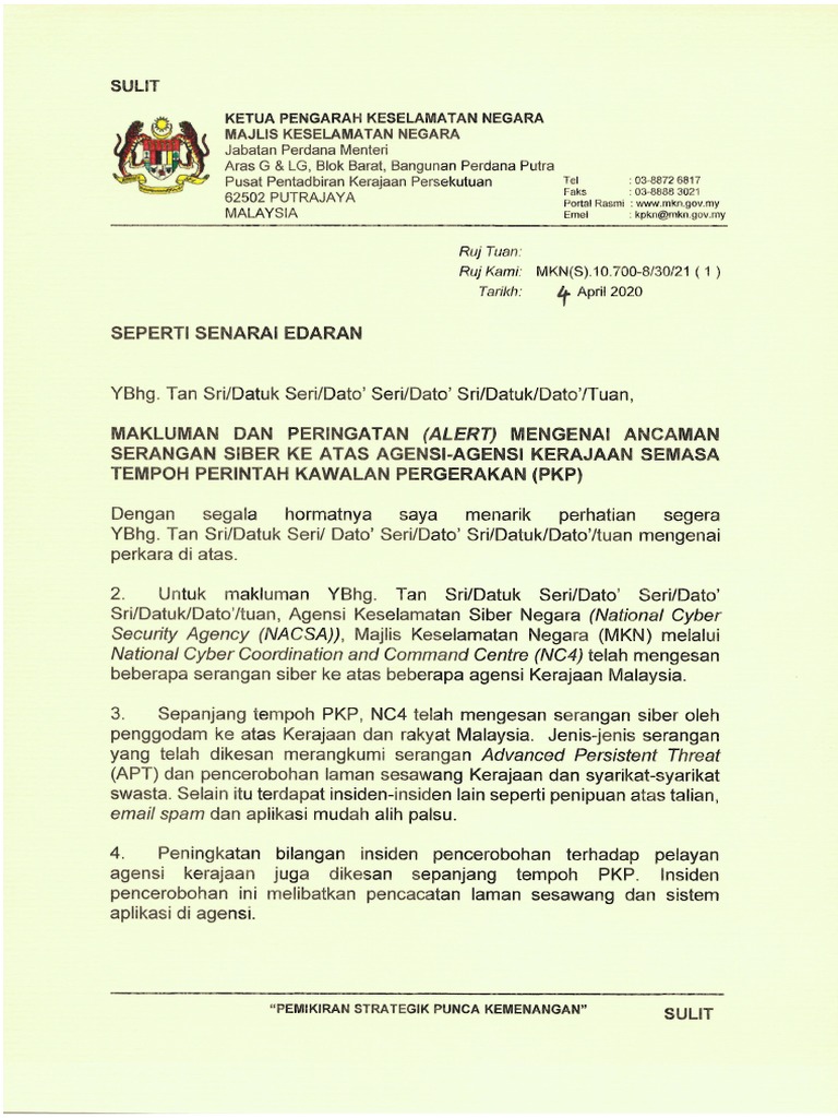 Majlis keselamatan negara, putrajaya, wilayah persekutuan, malaysia. Agensi keselamatan siber negara (nacsa) juga mengeluarkan amaran mengenai potensi serangan siber ke atas infrastruktur yang mensasarkan organisasi atau syarikat di malaysia. Sementara itu, pakar keselamatan siber, fong choong fook memberikan beberapa panduan kepada orang ramai supaya tidak terperangkap. Kerajaan malaysia melalui agensi keselamatan siber negara (ncsa) akan mengeluarkan strategi keselamatan siber negara pada pertengahan tahun ini 2019. Jenis serangan yang dikesan termasuk godaman, cubaan menggodam, distributed denial of service (ddos), web. Sazali berkata penurunan itu adalah disebabkan penguatkuasaan efektif yang dilakukan agensi penguatkuasaan kerajaan termasuk cybersecurity. Muhyiddin menegaskan soal keselamatan siber negara, terus menjadi keutamaan dalam agenda pertahanan dan keselamatan negara. Penggodaman laman web kerajaan di korea selatan dan amerika syarikat berlaku pada tahun 2009 juga di malaysia. Satu darjah disediakan khususnya adalah bsc keselamatan siber. Cari infonet»forum › peristiwa› polis, tentera & agensi keselamatan. Penggodaman siber dan kemusnahan akibat lumpuhnya keselamatan siber bukanlah suatu perkara baru. Berikut, antara inisiatif yang dijalankan adalah penubuhan agensi keselamatan siber kebangsaan (nacsa). Agensi keselamatan negara atau juga diterjemahkan sebagai perkhidmatan keselamatan pusat (bahasa inggeris: