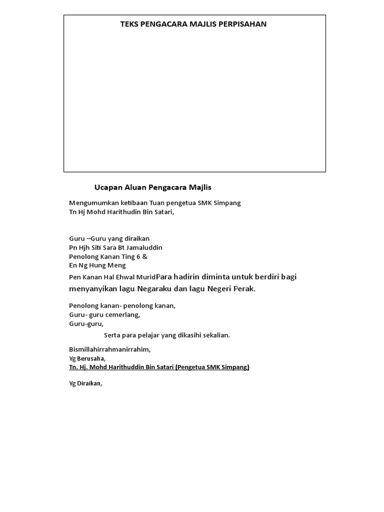 Teks Pengacara Majlis Perpisahan from imgv2-1-f.scribdassets.com Contoh teks ucapan pengacara majlis sempena hari guru. Jika ada, ianya kebetulan dan takdir semata. Majlis perkahwinan anakanda disediakan oleh: , tetamu jemputan pd mlm ini yng memimpin majlis kita pd mlm ini. Mengumumkan ketibaan yang diraikan en. Dijemput en jasni bin sahid selaku ketua dan wakil pembantu makmal untuk menuyampaikan ucapan, dipersilakan. Majlis penyampaian watikah perlantikan pengerusi dan naib pengerusi kumpulan pengakap daerah sik 2019. Sidang dataran sekalian smallprincess 10 mei 2016 8:24 ptg.