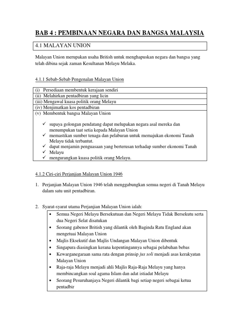 Bab 4 Pembinaan Negara Dan Bangsa Malaysia from present5.com Melahirkan pentadbiran yang licin …malayan union dibentuk untuk melicinkan pentadbiran tanah melayu. Sebab malayan union diperkenalkan 1.british ingin menghapuskan negara dan bangsa yang dibina sejak zaman kesultan melayu melaka. Sebab malayan union mendapat tentangan daripada orang melayu? Setelah berakhirnya perang dunia yang kedua, british telah kembali mentadbir tanah melayu. Akhir sekali, malayan union tidak dilaksanakan? Sebelum ini british menerima orang melayu sebagai pemilik tanah melayu. Pembentukan malayan union telah mendapat tentangan hebat daripada orang melayu.? Pertama ialah kedaulatan dan kuasa sultan terancam.