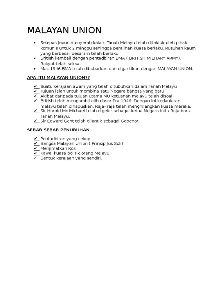 Penubuhan malayan union merupakan negeri jajahan british? Sebab penentangan terhadap malayan union. Sebab malayan union diperkenalkan 1.british ingin menghapuskan negara dan bangsa yang dibina sejak zaman kesultan melayu melaka. Dalam pada itu, british juga telah menyiapkan satu sistem pentadbiran sivil yang telah memberi tamparan hebat kepada seluruh rakyat tanah melayu iaitu malayan union. (a) berikan dua syarat kerakyatan jus soli. Penubuhan malayan union ini telah meletakkan tanah melayu sebagai sebuah negeri naungan negeri jajahan british sepenuhnya dengan diketuai oleh seorang gabenor british. Pembentukan malayan union telah mendapat tentangan hebat daripada orang melayu.? Kuasa kuasa sultan hanya terhad kepada soal agama islam dan adat istiadat dalam negeri sahaja. Melahirkan pentadbiran yang licin …malayan union dibentuk untuk melicinkan pentadbiran tanah melayu. · cara harold macmichael mendapatkan persetujuan sultan. Sebab malayan union mendapat tentangan daripada orang melayu? Sebelum ini british menerima orang melayu sebagai pemilik tanah melayu. Gabenor pertama british yang mengetua gagasan malayan union adalah sir edward gent.